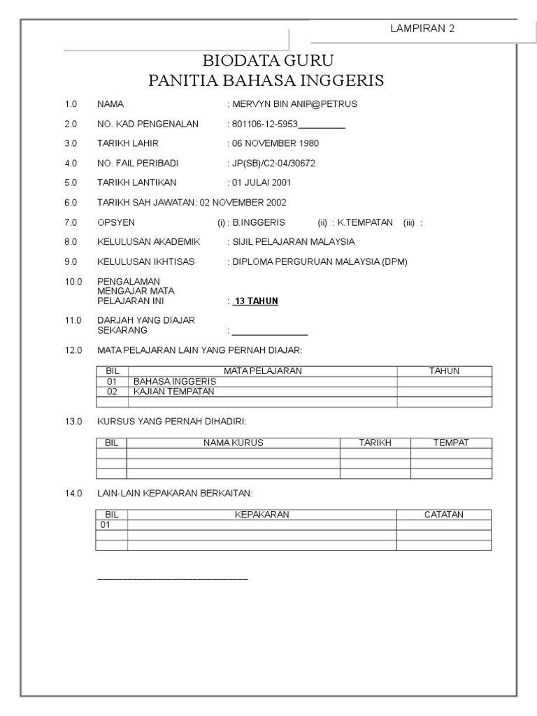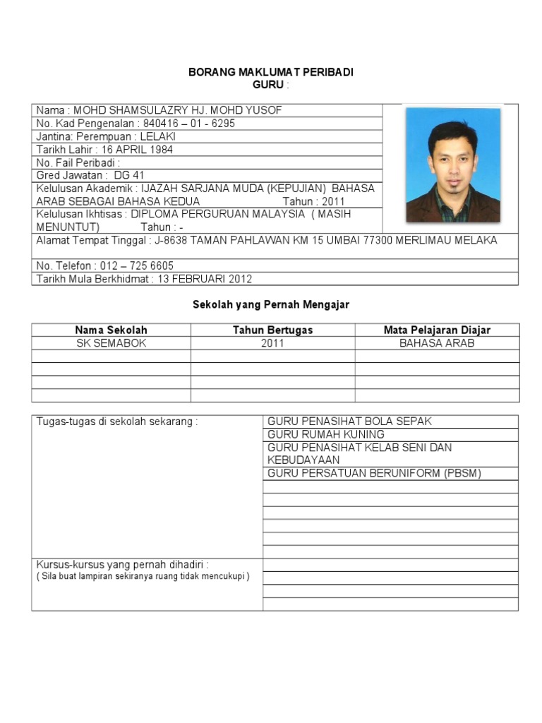 Contoh Borang Biodata Guru Untuk Fail Panitia Pdf