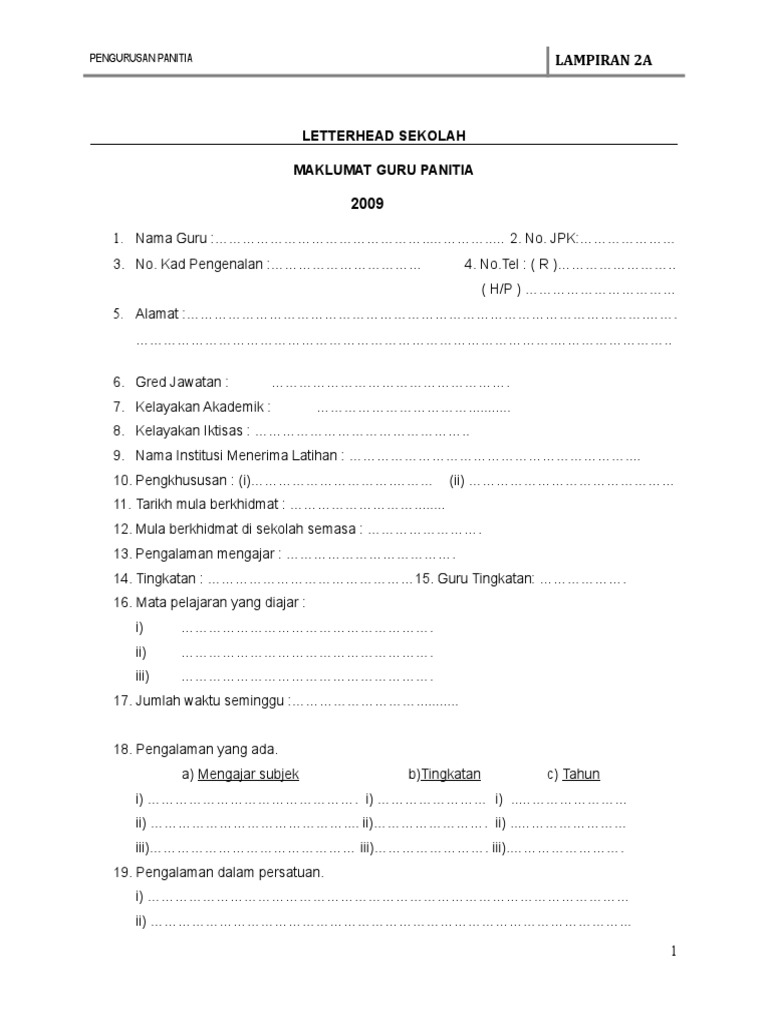 Borang Maklumat Guru Panitia Pdf